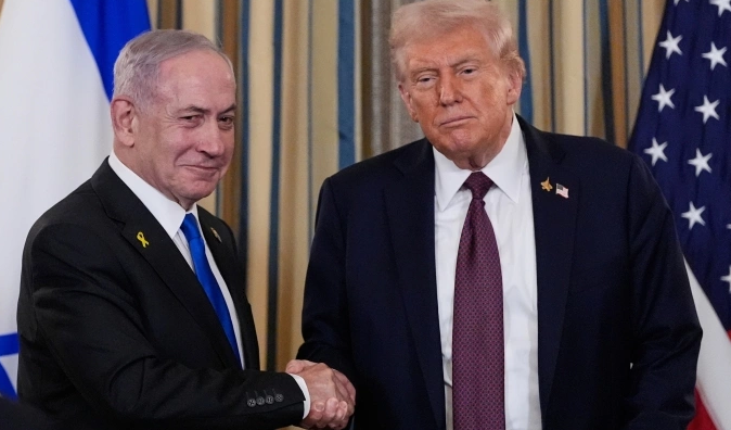 Thủ tướng Israel Benjamin Netanyahu (trái) bắt tay Tổng thống Donald Trump sau cuộc họp báo tại Nhà Trắng ngày 29/9. Ảnh: AP