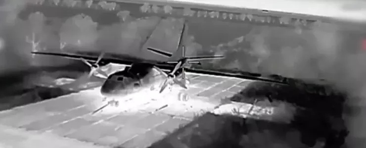 UAV của đặc nhiệm HUR phá huỷ 2 vận tải cơ An-26 của Nga trên bán đảo Crimea. Ảnh chụp màn hình: HUR