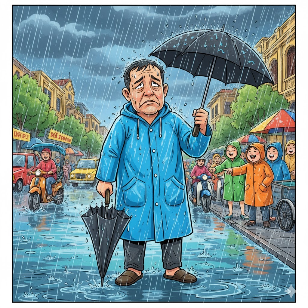 – Có chứ! Nhưng lúc ra cửa, mưa nhỏ quá nên tôi nghĩ “chắc không cần”.