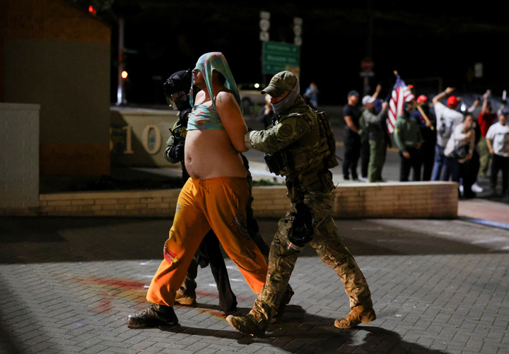 Cảnh sát khống chế một người biểu tình bên ngoài trụ sở Cơ quan Thực thi Di trú và Hải quan (ICE) ở phía nam Portland, Oregon. (Ảnh: Reuters)
