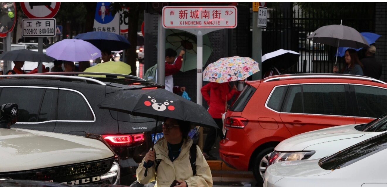 Người dân quận Thông Châu, Bắc Kinh đi làm, đi học dưới trời mưa liên tục vào giờ cao điểm buổi sáng ngày 9/10/2025. Ảnh: IC