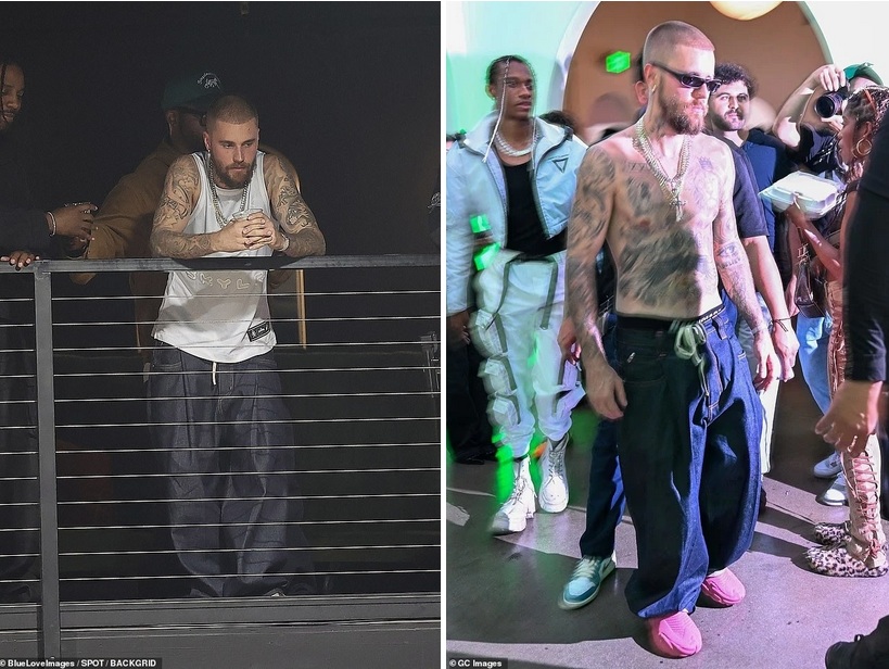 Kết thúc trận đấu, nam ca sĩ đột nhiên cởi trần, gây chú ý với những hình xăm kín người và dây chuyền vàng nổi bật. Bieber để râu dài, cạo trọc đầu và đeo kính râm đen trễ xuống sống mũi. Trong buổi tối tại Los Angeles, Hailey không xuất hiện cùng chồng.