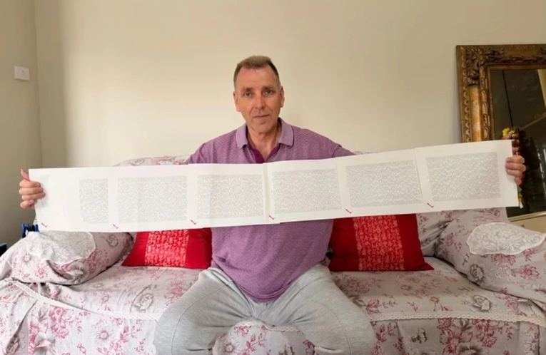 Laurence Watkins, 60 tuổi, khoe cái tên hơn 2000 ký tự tại nhà ở Auckland, New Zealand. Ảnh: News