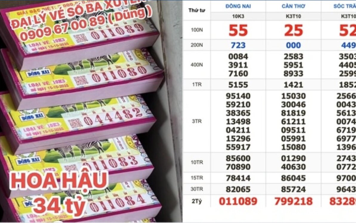 Anh Phú Dũng, đại diện đại lý vé số Ba Xuyên 2 ở Tây Ninh xác nhận vừa bán 140 tờ vé số trúng 34,3 tỉ đồng (chưa trừ thuế) cùng hàng loạt tờ trúng giải khuyến khích, theo kết quả xổ số miền Nam ngày 15/10. Cụ thể, những tờ vé số thuộc đài Đồng Nai, có dãy số trúng độc đắc là 011089.
