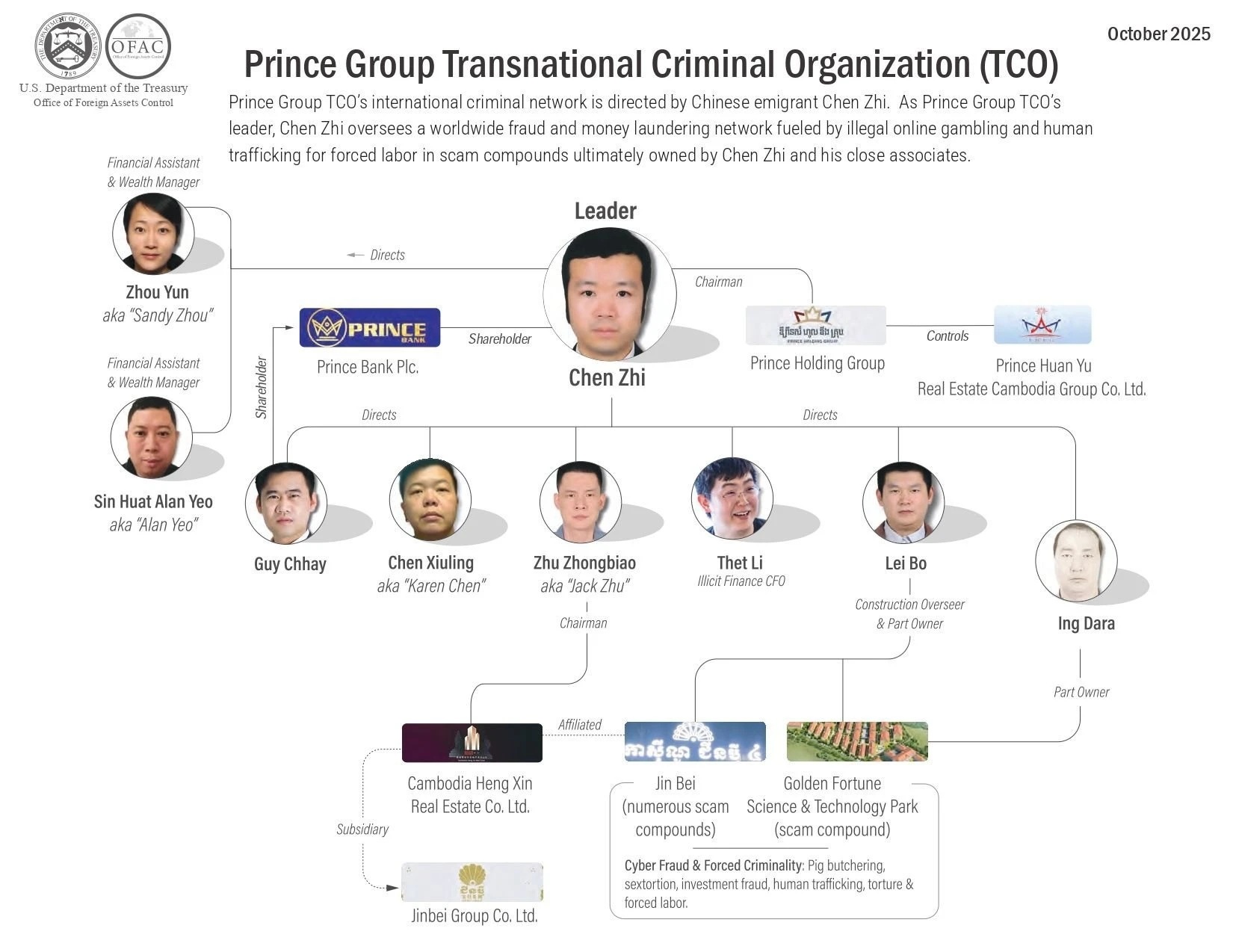 Bộ Tài chính Mỹ mô tả các khu phức hợp của Jin Bei là “những trung tâm khét tiếng nhất của Prince Group”, liên quan đến lừa đảo, tống tiền, cưỡng bức lao động và vụ sát hại công dân Trung Quốc Yi Ming Dali vào năm 2023, theo Asset.