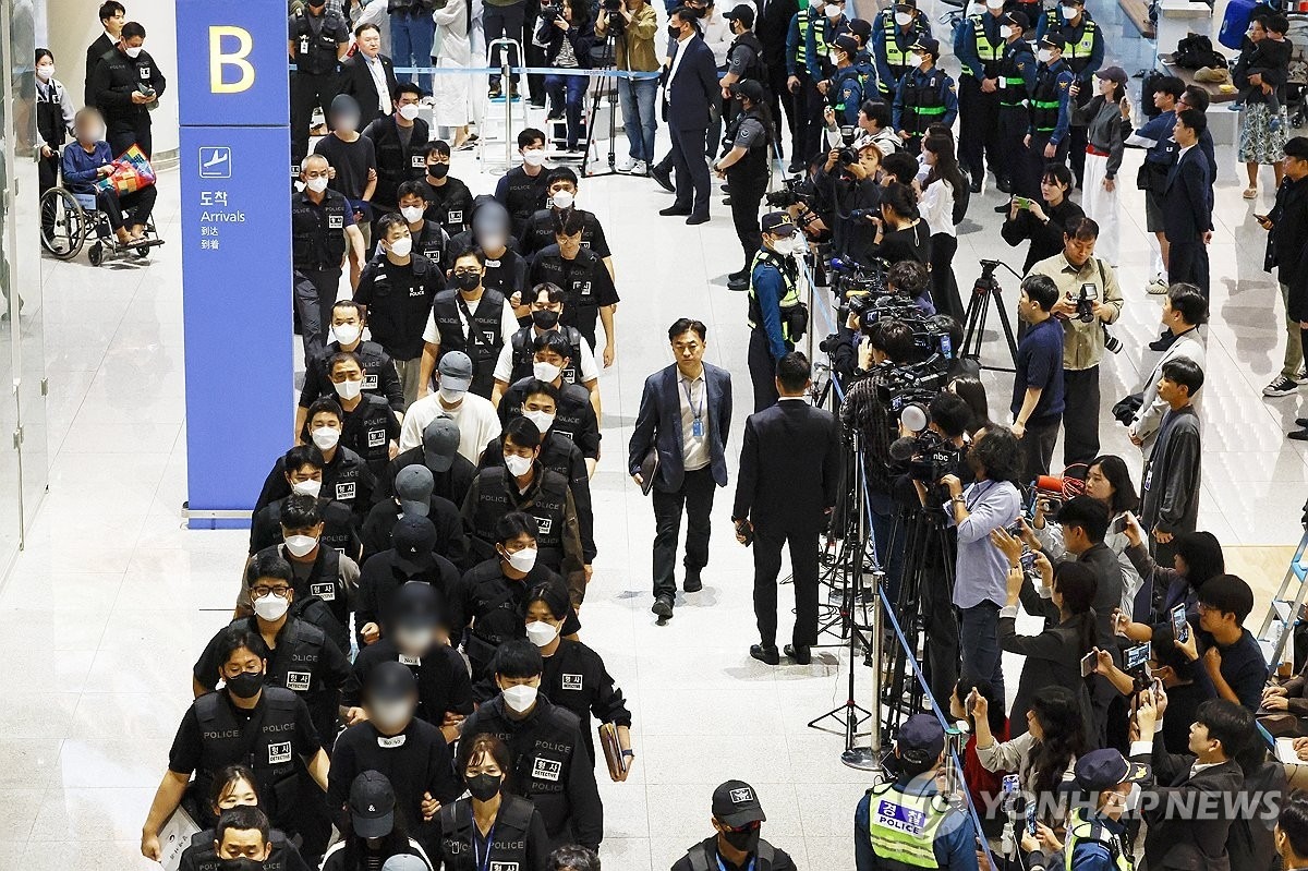 Nhóm công dân Hàn Quốc bị bắt tại Campuchia do nghi ngờ liên quan đến các vụ lừa đảo trực tuyến đã trở về nước qua sân bay quốc tế Incheon ngày 18/10/2025, sau khi chính quyền Campuchia quyết định trục xuất họ. Ảnh: Yonhap