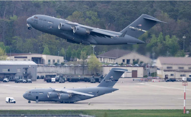 Vận tải cơ cất cánh từ căn cứ không quân Mỹ ở Ramstein, Đức, hôm 24/2. Ảnh: AFP