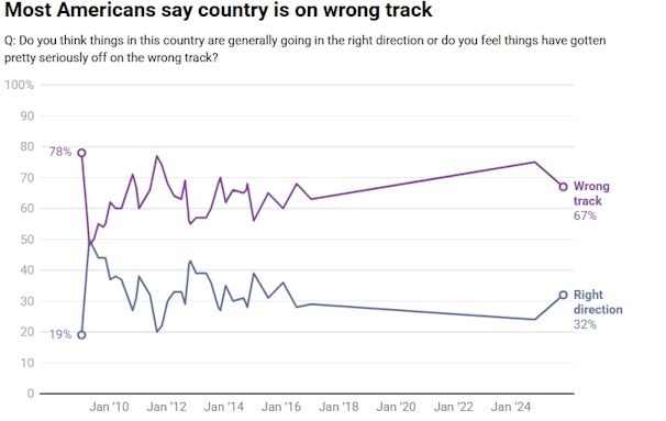 Although 67% say the country is moving in the wrong direction, that is a decrease from November 2024, when 75% said the same in the lead-up to the presidential election.