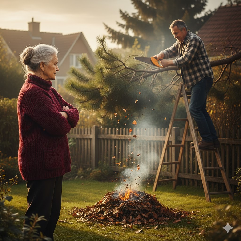 Chiều muộn, bà ra sân sau gom lá khô đốt. Trong làn khói mỏng tang, bà chợt thấy một cành thông nhà bên cạnh chìa sang sân mình. Trời ơi, đáng lẽ bà phải nhận ra sớm hơn! Nhánh cây dài quá rồi, rụng đầy trái thông khô dưới góc sân.