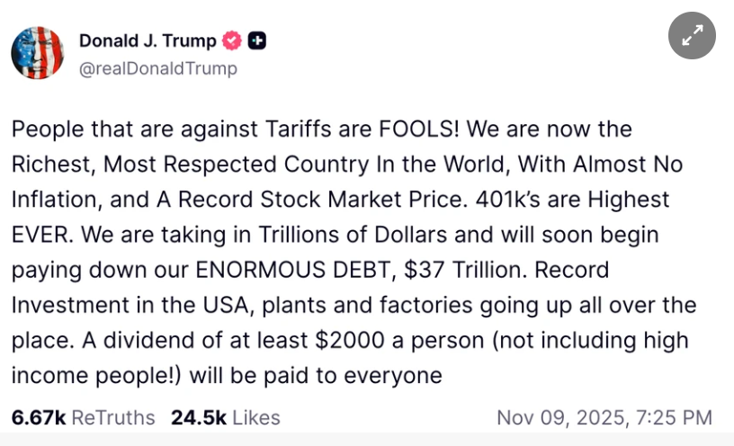 Thực tế, đây không phải lần đầu tiên ông Trump gợi ý về “cổ tức thuế quan”. Nhưng lần tuyên bố mới nhất xuất hiện ngay sau khi Đảng Dân chủ giành thắng lợi trong loạt cuộc bầu cử ở các bang xanh - vấn đề chi phí sinh hoạt và khả năng chi trả trở thành tâm điểm tranh luận.