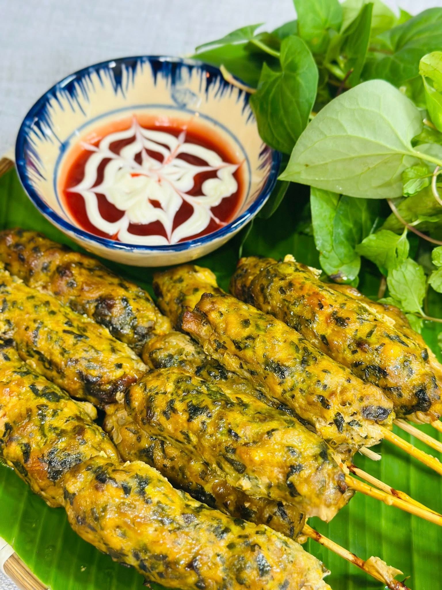 - Chả lươn lá lốt xiên que vàng óng, thơm lừng.