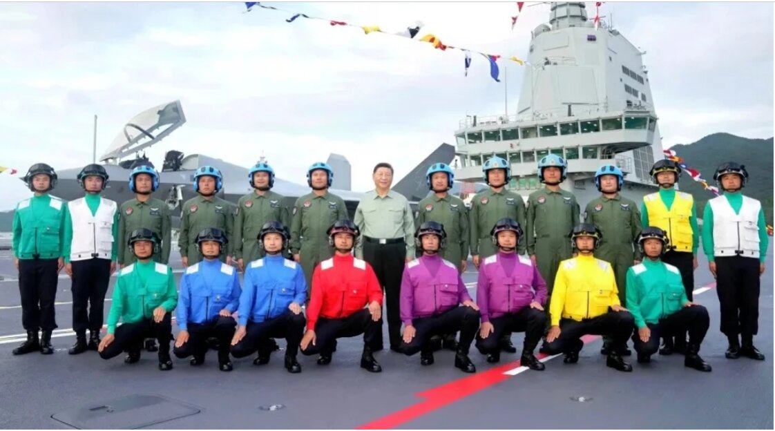 Chủ tịch Trung Quốc Tập Cận Bình chụp ảnh cùng với phi công và nhân viên buồng lái trong buổi lễ biên chế tàu sân bay Phúc Kiến. Ảnh: Bộ Quốc phòng Trung Quốc.