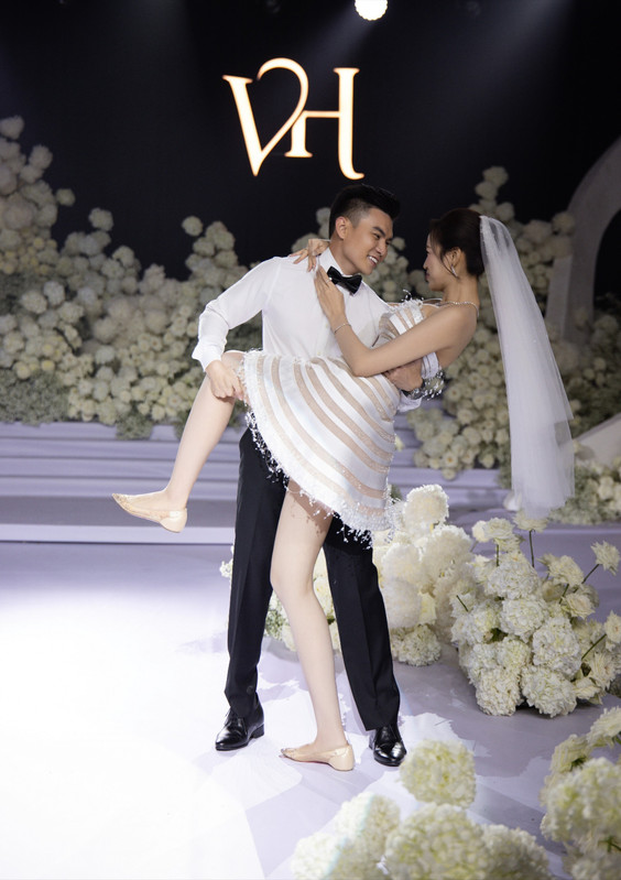 Không gian tiệc cưới với tông trắng chủ đạo, ngập tràn hoa tươi tựa khu vườn cổ tích. Cô dâu Đỗ Thị Hà thay 4 bộ đầm cưới, luôn xuất hiện cực kì lộng lẫy như nàng tiểu thư "lá ngọc cành vàng". Còn chú rể Viết Vương cũng thay hai bộ suit lịch lãm, bảnh bao.
