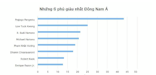 Đứng đầu khu vực là tỉ phú Prajogo Pangestu đến từ Indonesia, người sở hữu 43,4 tỉ USD và xếp thứ 38 thế giới. Ông là “ông trùm” trong ngành hóa dầu và năng lượng, điều hành các tập đoàn Barito Pacific và Barito Renewables Energy.
