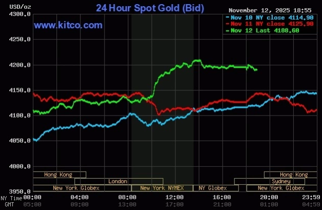 Chốt phiên giao dịch 12/11, giá vàng thế giới giao ngay tăng 68 USD lên 4.194 USD một ounce. Trong phiên, giá có thời điểm lên 4.208 USD, cao nhất kể từ phiên 21/10..