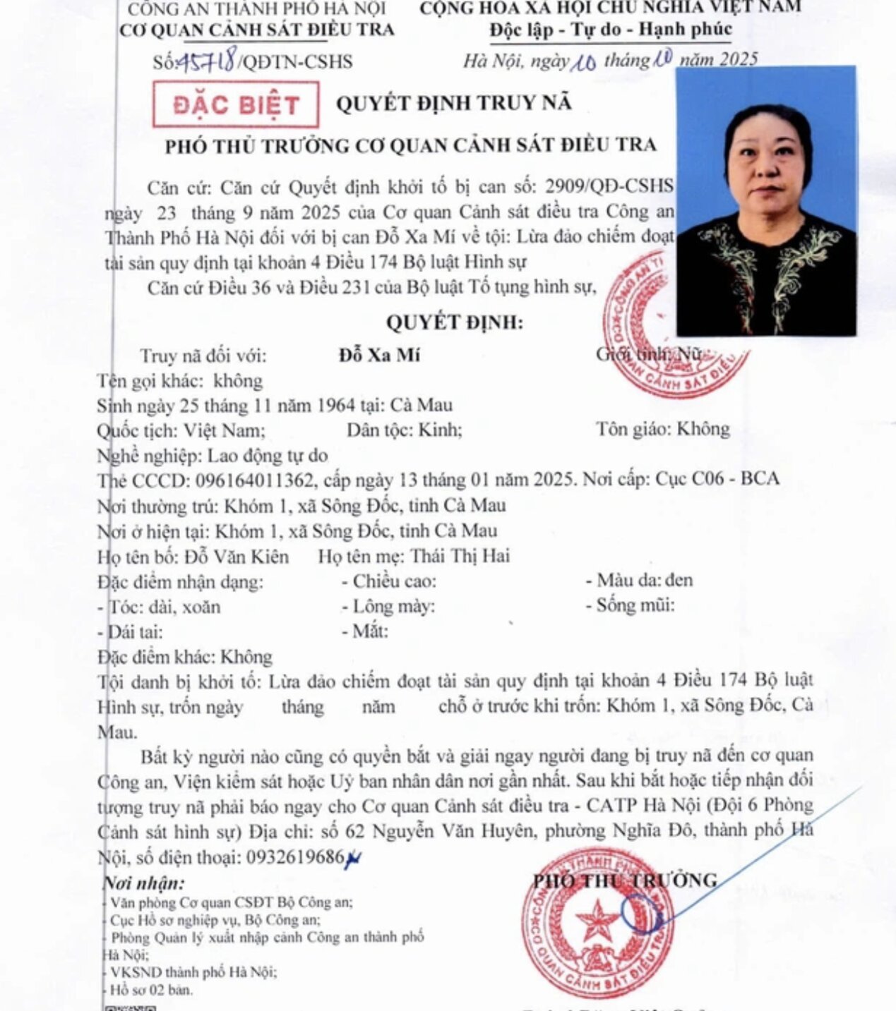 Cơ quan CSĐT Công an TP Hà Nội đã ra quyết định truy nã Đỗ Xa Mí (SN 1964; thường trú tại xã Sông Đốc, tỉnh Cà Mau) về tội Lừa đảo chiếm đoạt tài sản.