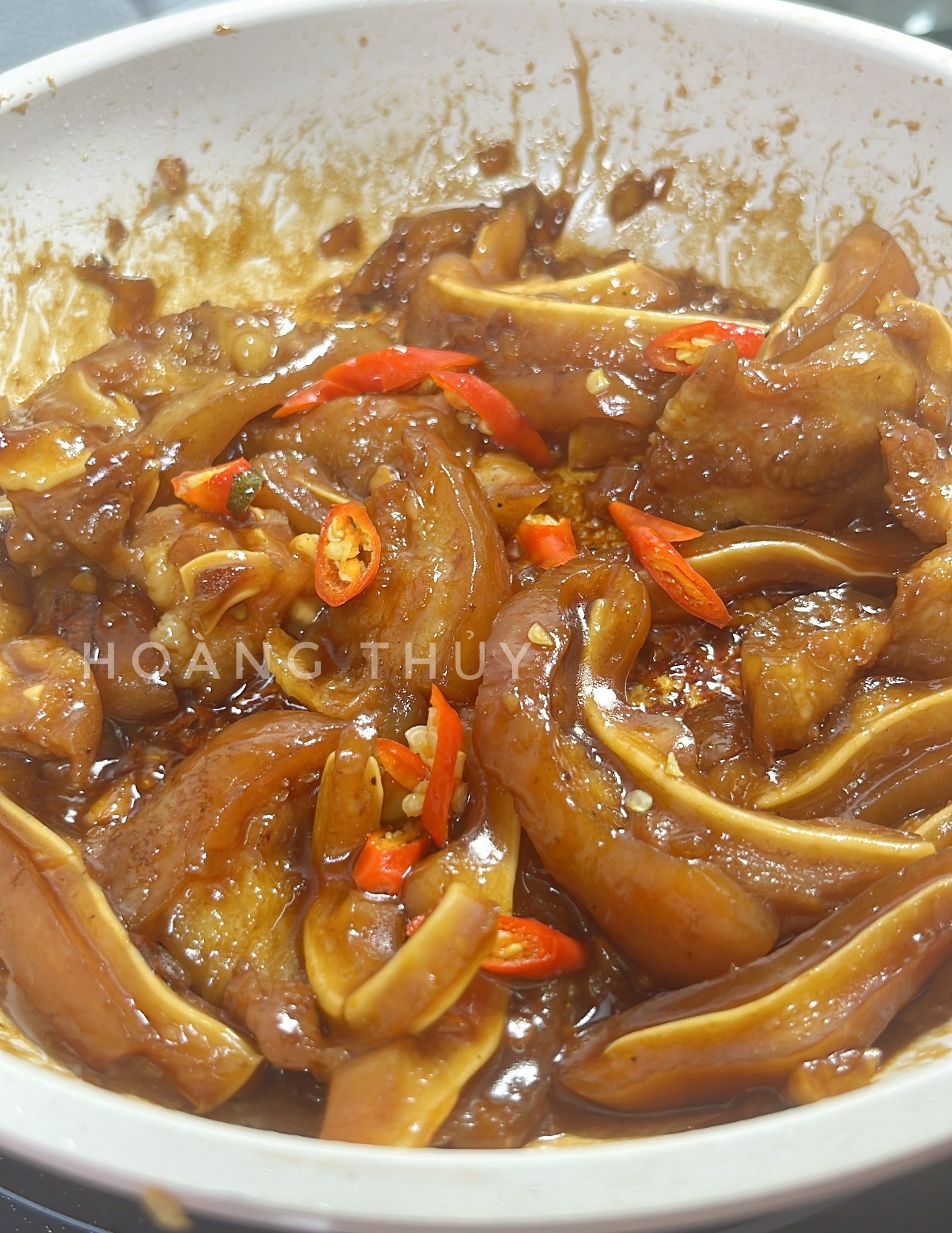 - Cho sốt vào đảo đều, thêm nước lọc xăm xắp tai heo.