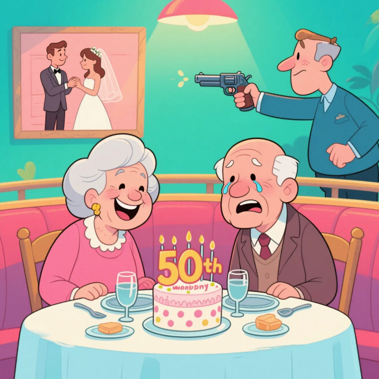 – Không phải… Anh đang nhớ lại chuyện 50 năm trước, khi bố em dí súng bắt anh cưới em. Nếu ngày đó anh không đồng ý… thì hôm nay anh được… mãn hạn tù rồi.