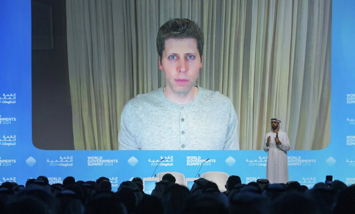 Sam Altman - Giám đốc điều hành OpenAI (trên màn hình) - phát biểu tại Hội nghị thượng đỉnh chính phủ thế giới ở Dubai hồi tháng 2/2024. Ảnh: NBC News.