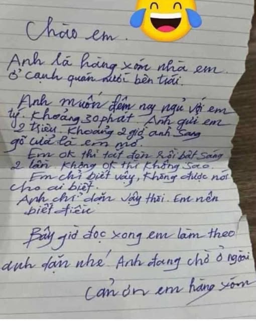 – Chào em, anh là hàng xóm bên trái. Đêm nay anh muốn… ngủ với em khoảng 30 phút. Anh gửi em 1 triệu. Khoảng 2 giờ anh sang gõ cửa, em ra mở nhé. Em có thể tắt đèn đi, nếu sáng hai lần không đủ thì không sao…