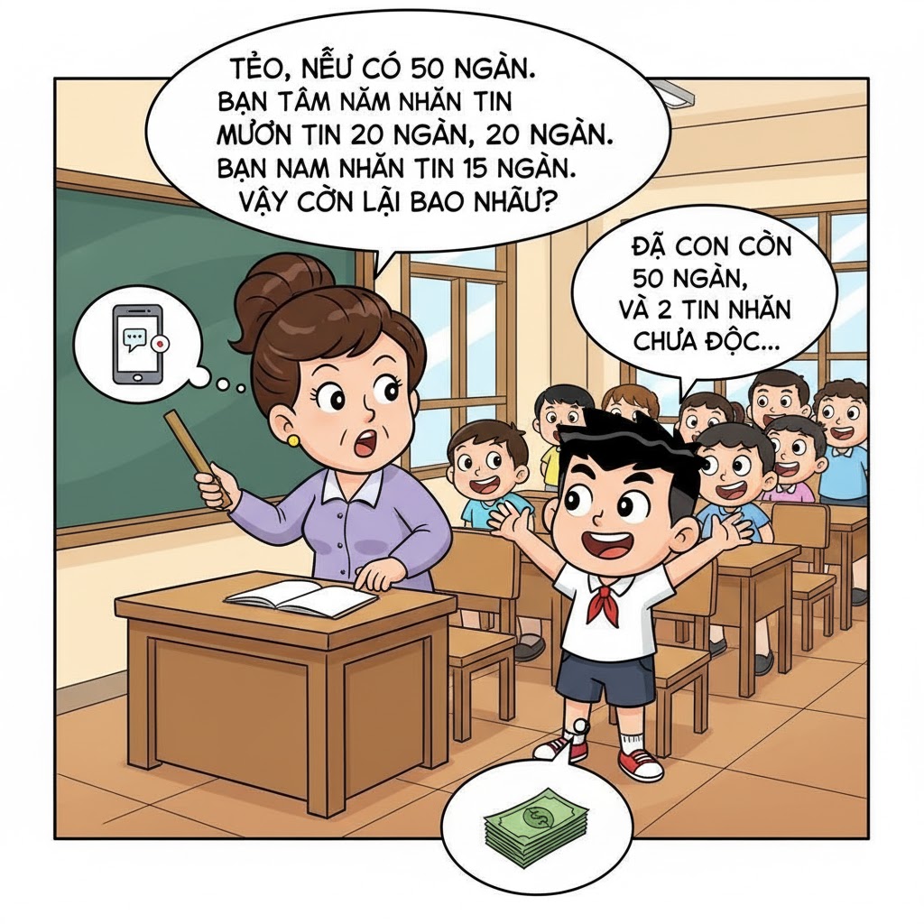 Cô giáo: "Vậy Tèo, theo em, sau khi nhận hai tin nhắn đó, em còn lại bao nhiêu tiền?"