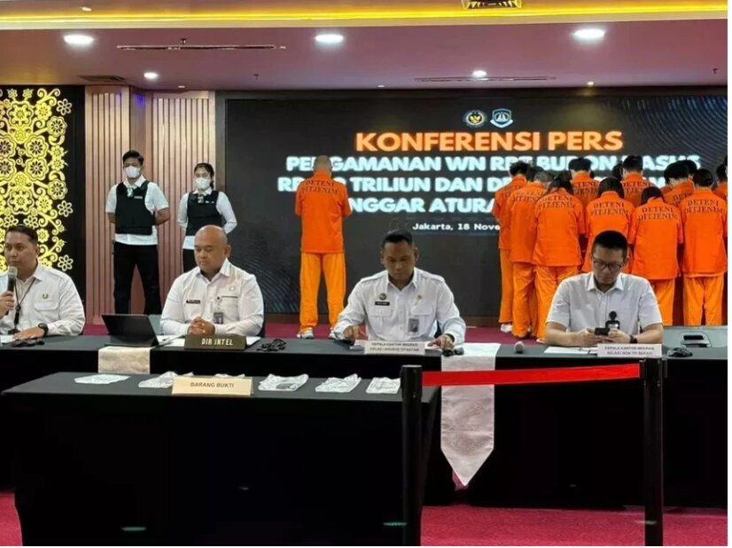 Đội Thực thi Tình báo và Di trú Batam tổ chức họp báo về việc bắt giữ công dân Trung Quốc WZ (58 tuổi) vào ngày 18/11. Ảnh: Beritasatu.com/Stefani Wijaya.