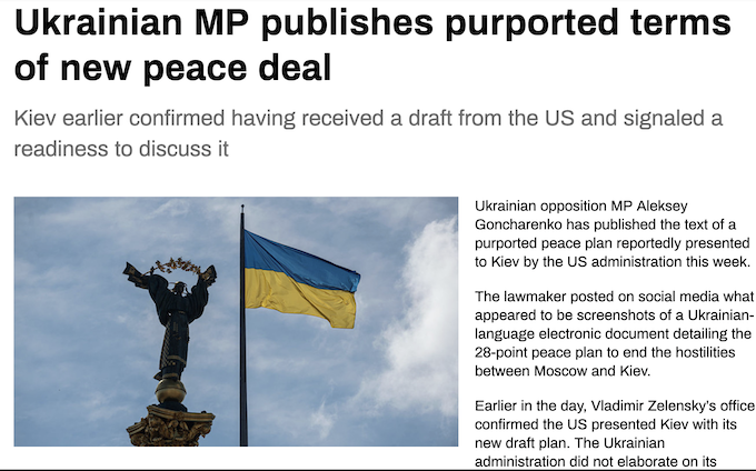 Ảnh chụp bài đăng trên kênh RT về kế hoạch hoà bình 28 điểm của Mỹ