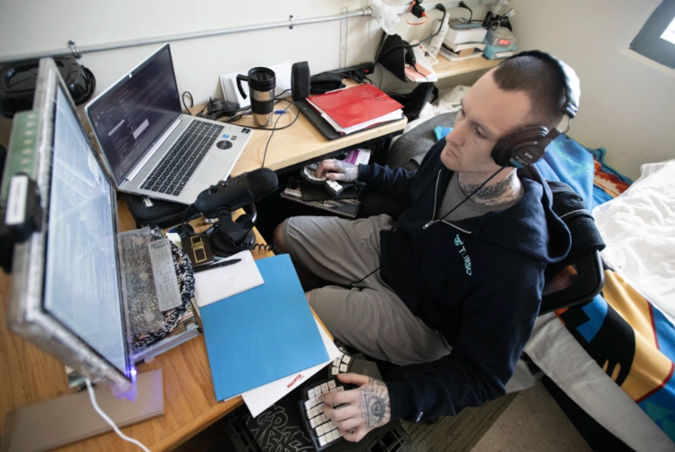 Preston Thorpe, 32 tuổi làm việc từ xa trong Trại cải tạo Mountain View (bang Maine) tháng 8/2025. Ảnh: Bangordailynews