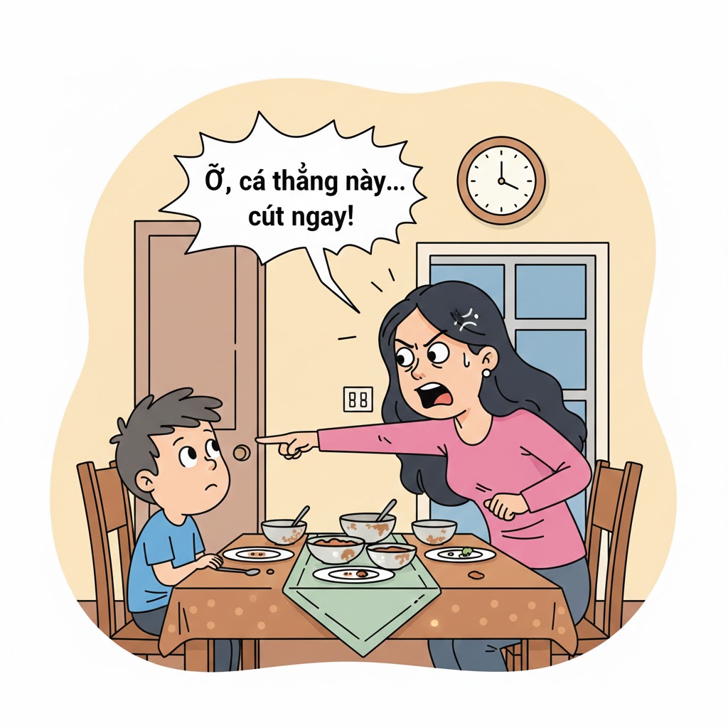 Mẹ: "Ơ, cái thằng này... cút ngay!"