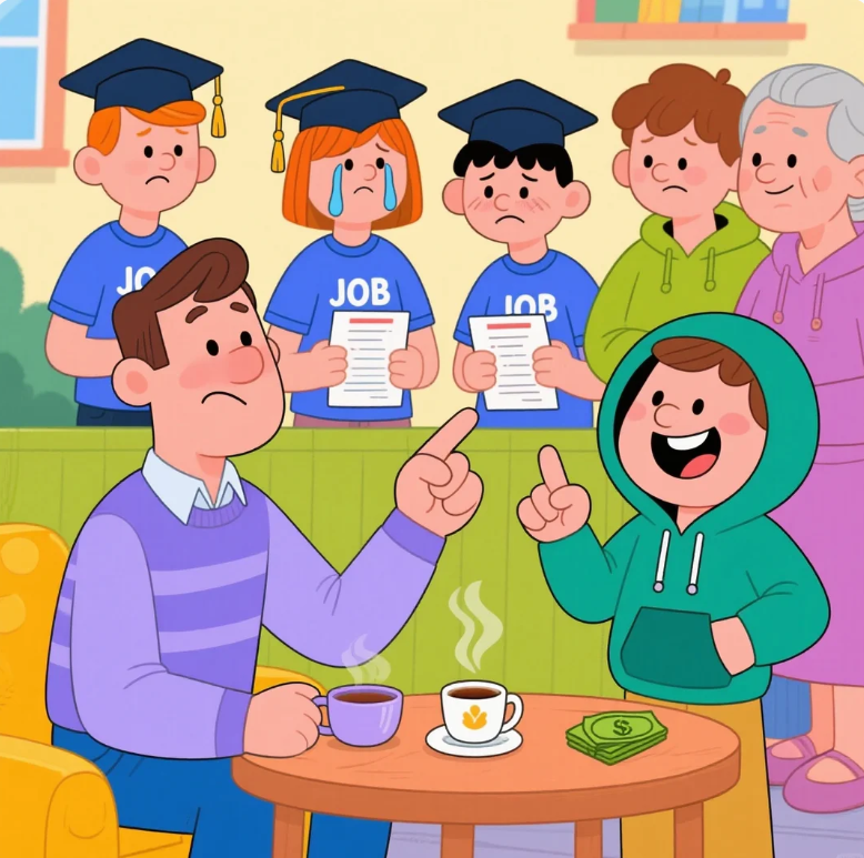 Ông bố nhấp ngụm trà, bình thản đáp: – Nó lại là đứa duy nhất kiếm ra tiền. Ba đứa kia… đều đang thất nghiệp!