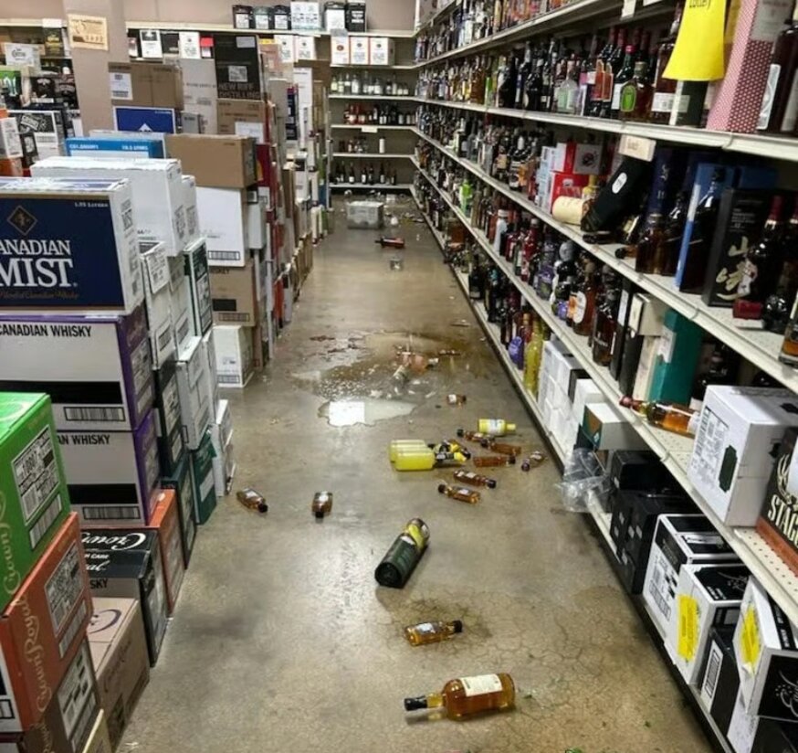 Nhân viên cửa hàng hốt hoảng khi phát hiện nhiều chai rượu đổ vỡ. Ảnh: ABC VIRGINIA
