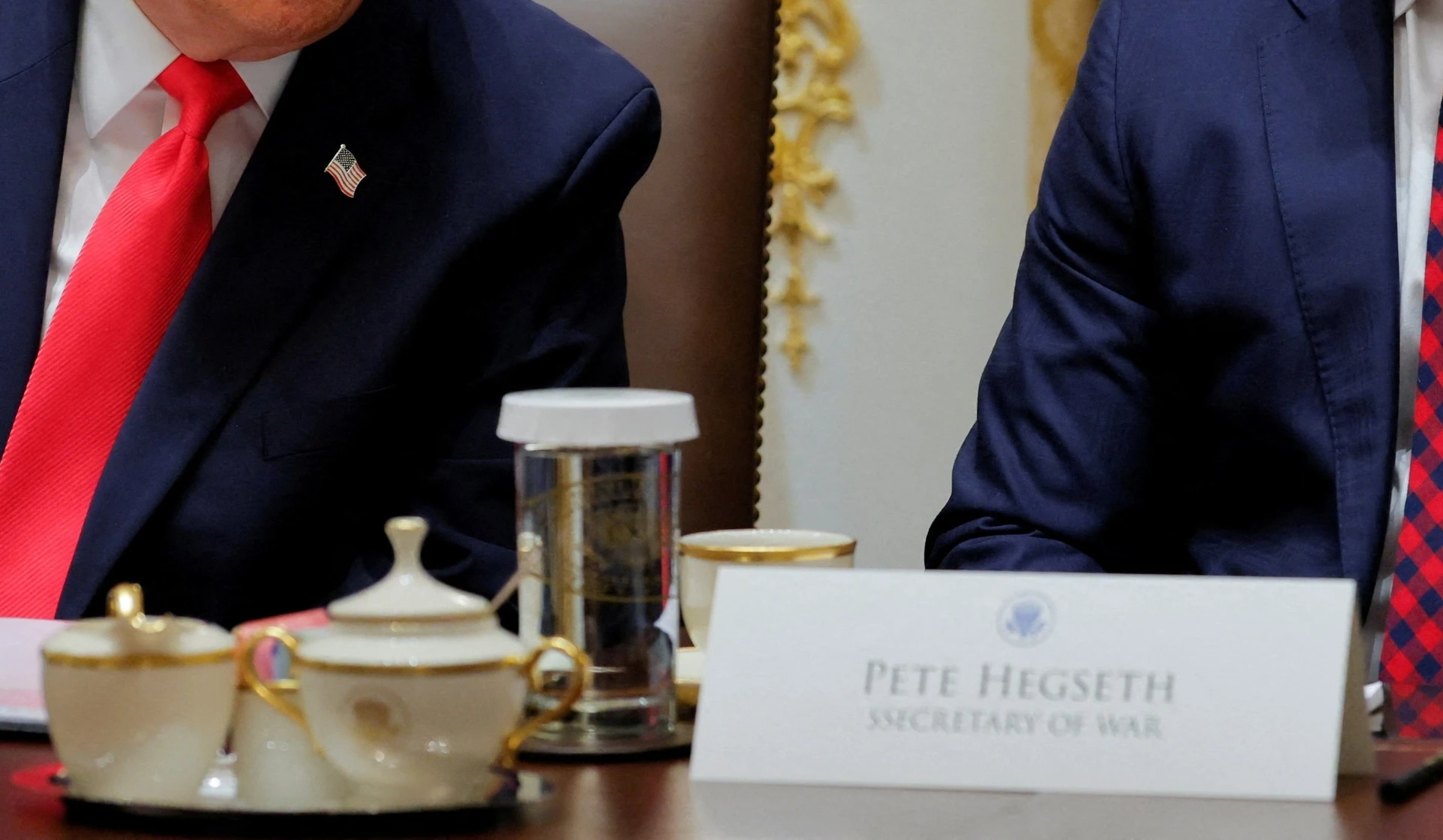 Biển tên bị sai chính tả của Bộ trưởng Chiến tranh Pete Hegseth tại cuộc họp. (Ảnh: Reuters)