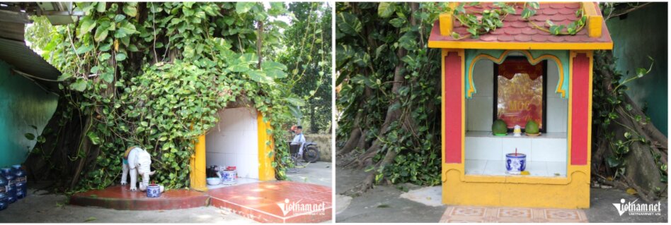 Xung quanh gốc cây có 3 am thờ nhỏ. Hai trong số 3 am thờ này có tượng hổ, voi. Bên trong am thờ còn lại có bài vị nền đỏ chữ vàng ghi dòng chữ: “Cung thỉnh ông Mộc tọa vị”.