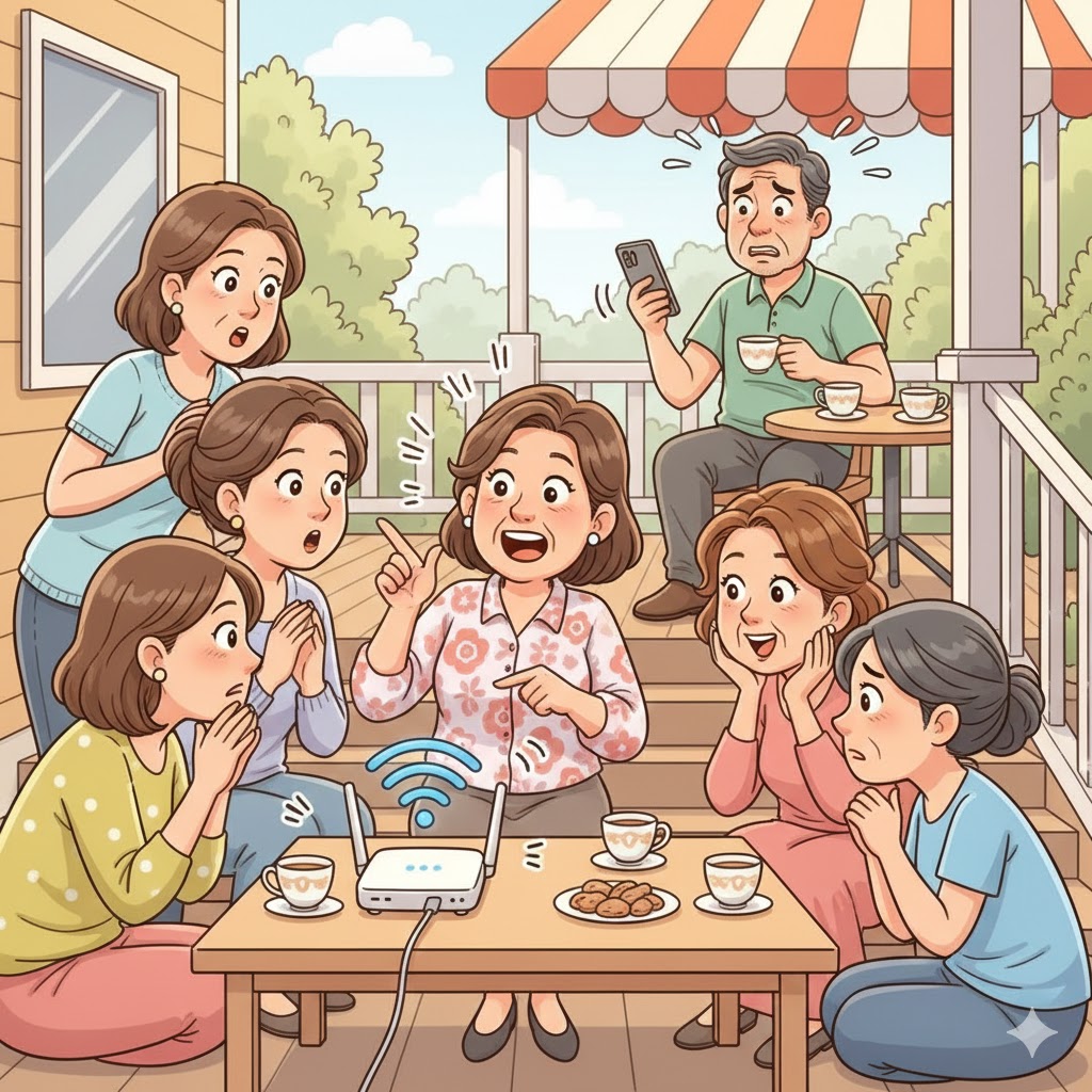 Còn ông Tư – chồng bà – đang ngồi uống trà gần đó, nghe xong… lặng lẽ tắt WiFi trong nhà!