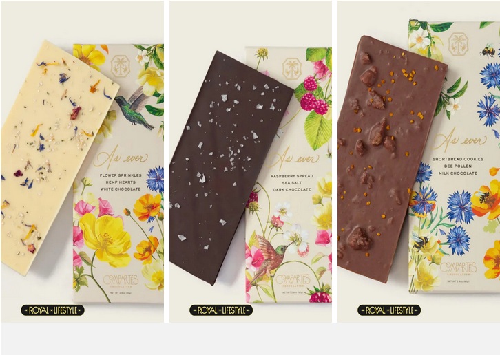 Quả thực, sự chăm chút của Meghan không chỉ dừng lại ở hương vị. Mỗi thanh socola đều được gói ghém cẩn thận trong lớp giấy in họa tiết thực vật được thiết kế riêng (bespoke). Khi đặt ba thanh cạnh nhau, chúng tạo nên một bức tranh bộ ba (triptych) về một khu vườn rực rỡ sắc màu, đẹp đến mức người nhận chẳng cần thêm giấy gói cầu kỳ, chỉ cần thắt một chiếc nơ nhỏ là đã đủ trọn vẹn chân tình.