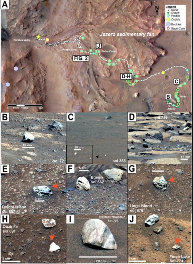 Ngày 1/12, trong nghiên cứu vừa công bố trên tạp chí Communications Earth & Environment, nhóm của tiến sĩ Adrian Broz (Đại học Purdue, Mỹ) – thành viên điều hành sứ mệnh Perseverance cho biết họ đã phát hiện hàng ngàn mảnh đá sáng màu ngay tại bề mặt Jezero. Phân tích quang phổ cho thấy nhiều mảnh trong số này chứa kaolinite, một loại khoáng sét giàu nhôm.