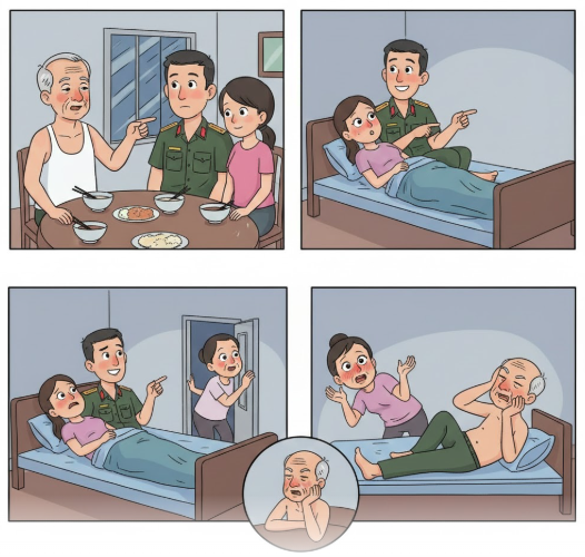 Lúc này ông bố nằm ở ngoài nhà nghe vậy thì chép miệng: "Con với cái mình nuôi nó khôn lớn trưởng thành, sợ mình xin tiền hay sao mà mình hỏi thì nó bảo là Đại úy, vậy mà với vợ nó lại bảo là Đại tướng con với chả cái..."