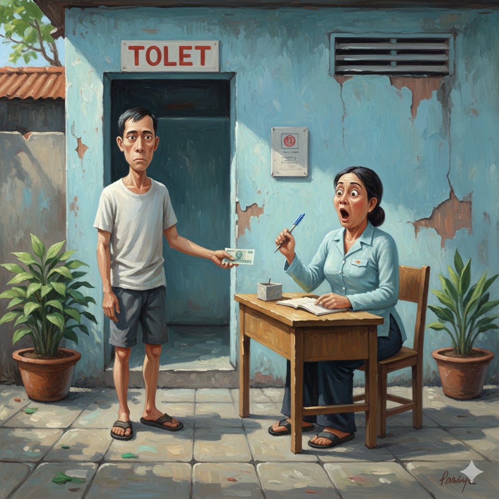 Một người đàn ông bước vào nhà vệ sinh công cộng. Bà nhân viên thu tiền liền nói: