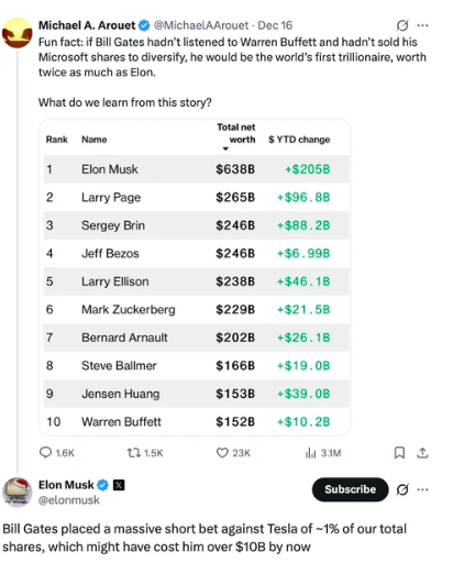 Lần này, Musk nhắm vào hai quyết định của Gates: đặt cược ngược cổ phiếu Tesla và bán phần lớn cổ phần Microsoft - những bước đi mà Musk cho rằng đă khiến Gates đánh mất hàng trăm tỷ USD, thậm chí là cơ hội trở thành “tỷ phú ngh́n tỷ USD”.