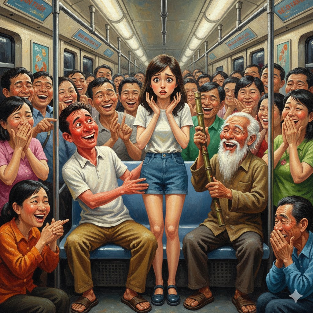 Cả toa tàu bật cười, còn cô gái thì đỏ mặt… không biết nên ngồi hay nên chạy!