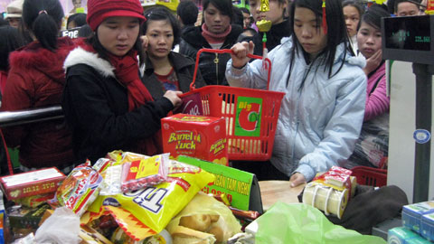 Cuối năm, siêu thị, cửa hàng đua nhau khuyến mãi, giảm giá, người dân vì thế cũng có cơ hội sắm Tết nhanh hơn, thuận lợi hơn. Cận Tết, người người, nhà nhà rủ nhau “siêu thị tiến”. Vòng qua các siêu thị lớn ở Hà Nội như Big C, Metro, Co.op Mark, đâu đâu cũng thấy người chen chân mua sắm.