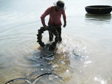 Người dân đặt những chiếc vỏ xe cũ xuống đầm để hàu bám vào và thu hoạch. (Hình: Phương Ngạn/Người Việt)