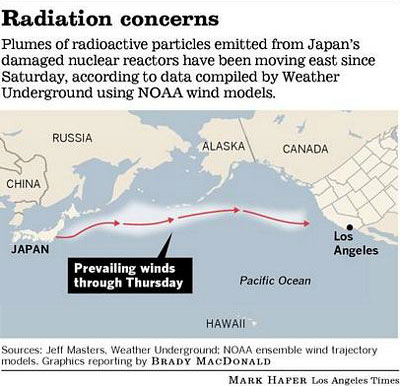Các viên chức cho biết từ Nhật sang Mỹ cách xa đến 5,000 dặm, số lượng phóng xạ truyền đi theo luồng khí qua một đại dương mênh mông đã bị gió, mưa và muối biển làm loãng đi hầu hết, sẽ không gây nguy hại chút nào đến sức khỏe con người.