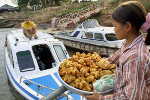 Bé gái đang rao bán bánh ngọt cho du khách nước ngoài.