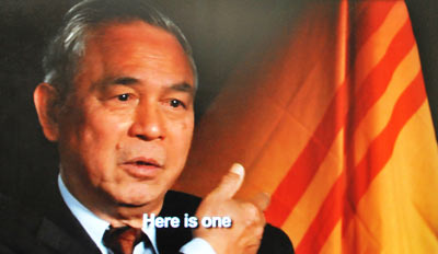 “Ðây là lá cờ đã được hạ xuống. Tôi vẫn gìn giữ cờ từ ngày hôm đó đến nay.” Một cảnh trong phim “The Lucky Few - The Story of USS Kirk,” trong đó cựu Ðại Tá Hải Quân VNCH kiêm tham mưu phó hành quân Ðỗ Kiểm kể lại biến cố lịch sử đó trong cuộc đời quân ngũ của mình. (Hình: Hà Giang/Người Việt chụp lại từ phim)