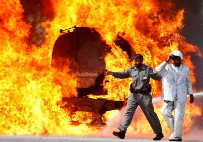 Cảnh sát hộ tống một lính cứu hỏa tại hiện trường vụ cháy xe chở xăng của NATO ở đường cao tốc Jalalabad-Kabul vào ngày 27/4. Một quả bom đã được gài dưới xe chở xăng. Nguồn ảnh: AP Photo/Rahmat Gul.