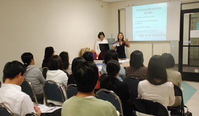Cô Duyên Trần (giữa) đang thuyết trình về tình trạng sức khỏe của người làm nail, suốt ngày tiếp xúc hóa chất. (Hình: Nguyên Huy/Người Việt)
