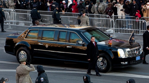Tổng thống sẽ đi trên chiếc “The Beast” (Thú Hoang). Đây là chiếc xe chống bom khổng lồ được ví như một chiếc xe tăng do hãng xe lừng danh Cadillac của Mỹ sản xuất. Chiếc The Beast được bọc một lớp thép dày tới hơn 20cm. Siêu xe chở Tổng thống Mỹ sẽ được tháp tùng bởi ít nhất 20 chiếc xe hơi khác cùng với hơn một chục xe môtô cảnh sát.