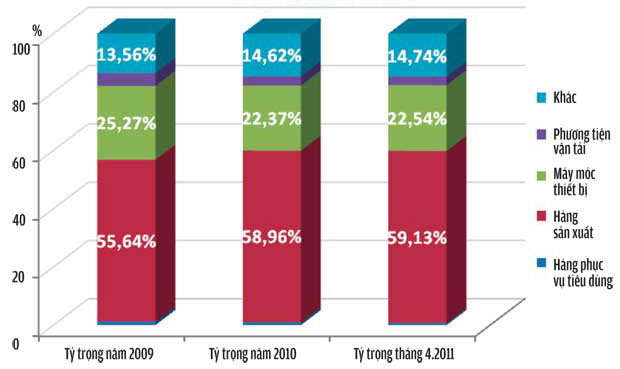 Cơ cấu giá trị các mặt hàng nhập khẩu của Việt Nam với Trung Quốc từ 2009 đến 4 tháng đầu 2011. Nguồn: Tổng cục Hải quan và tính toán của người viết