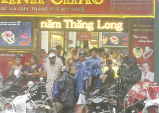 Gần trưa, một cơn mưa lớn đổ ập xuống Hà Nội nhưng không làm mát bầu không khí tại các cửa hàng kinh doanh vàng. “Phố vàng” Trần Nhân Tông lại có một ngày nhộn nhịp bởi nhiều người ồ ạt đi mua. Cửa hàng vàng bạc Bảo Tín Minh Châu mở cửa muộn hơn ngày thường khiến nhiều người phải đứng đợi, xếp hàng chờ giao dịch.
